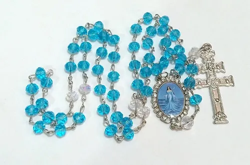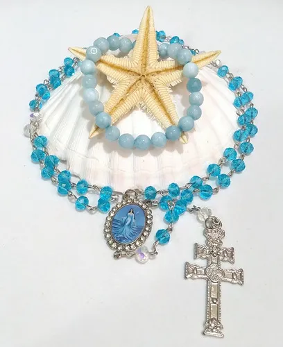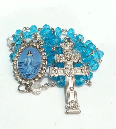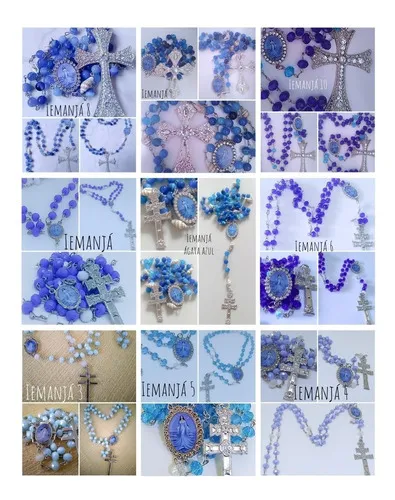O Terço em cristais em homenagem a Iemanjá é um produto feito conta por conta, proporcionando um acabamento fino, de alta qualidade e de uma beleza sem igual. O entremeio resinado cravejado de Strass, somado com o Santo Cruzeiro e o carinho que é feito cada terço o torna uma peça única
